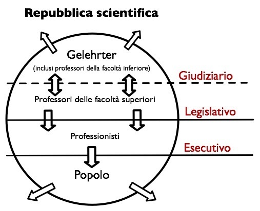 [59] La figura sottostante riproduce la struttura della repubblica scientifica, con la divisione dei poteri rispetto all'ambito conoscenza. Le frecce in uscita, dalle sezioni del cerchio che corrispondono al popolo e ai Gelehrter, stanno ad indicare che non si tratta di insiemi chiusi, e che è possibile passare dall'uno all'altro. Nella repubblica scientifica non c'è coazione; l'ambito in cui i ricercatori di base esercitano il loro potere è quello del “conflitto”, delle dispute tra gli scienziati.